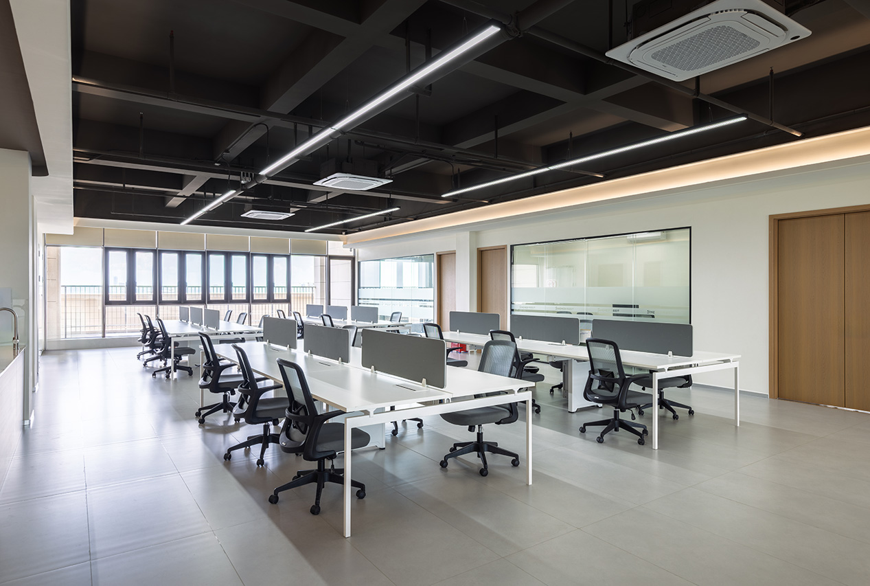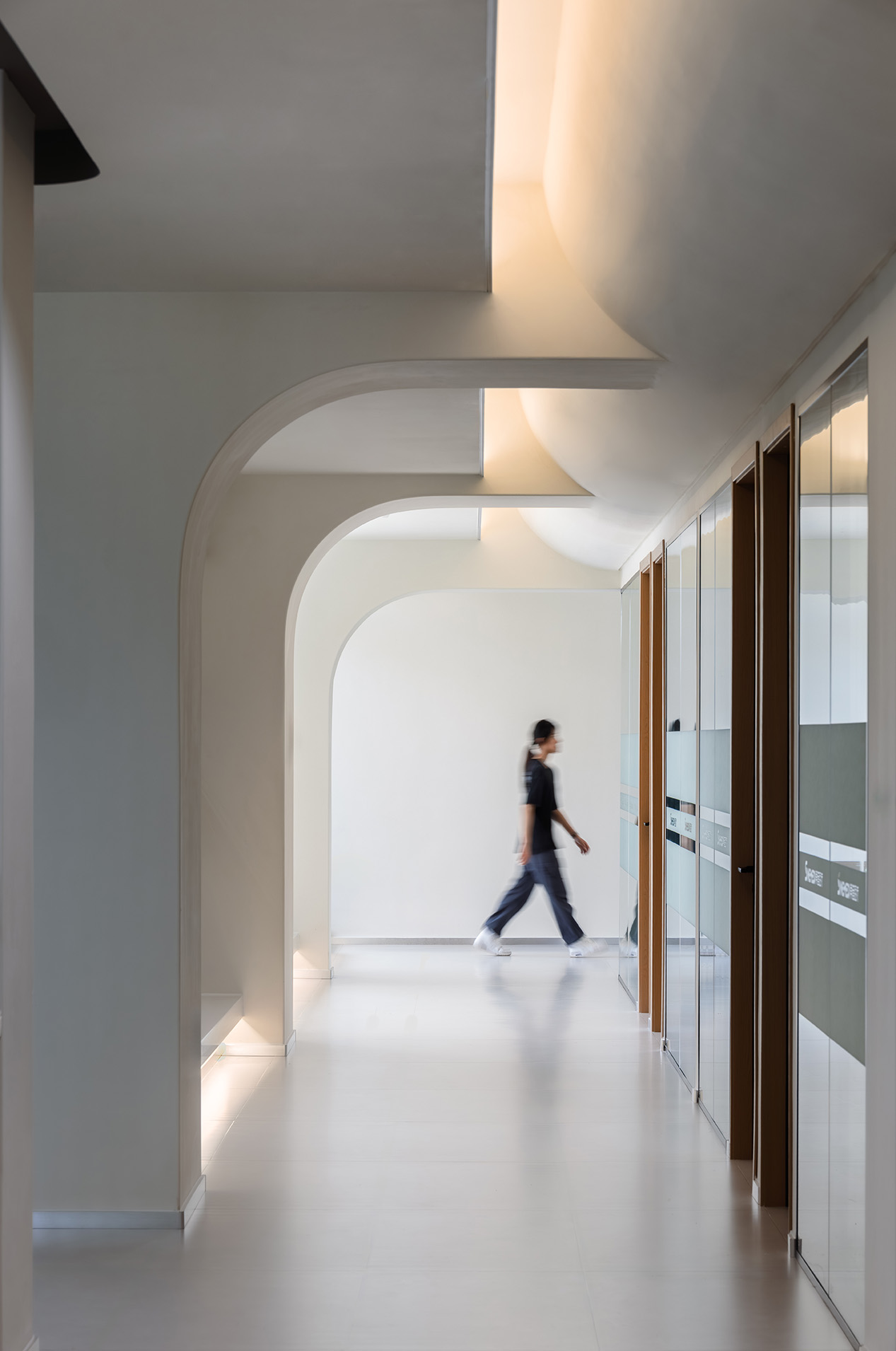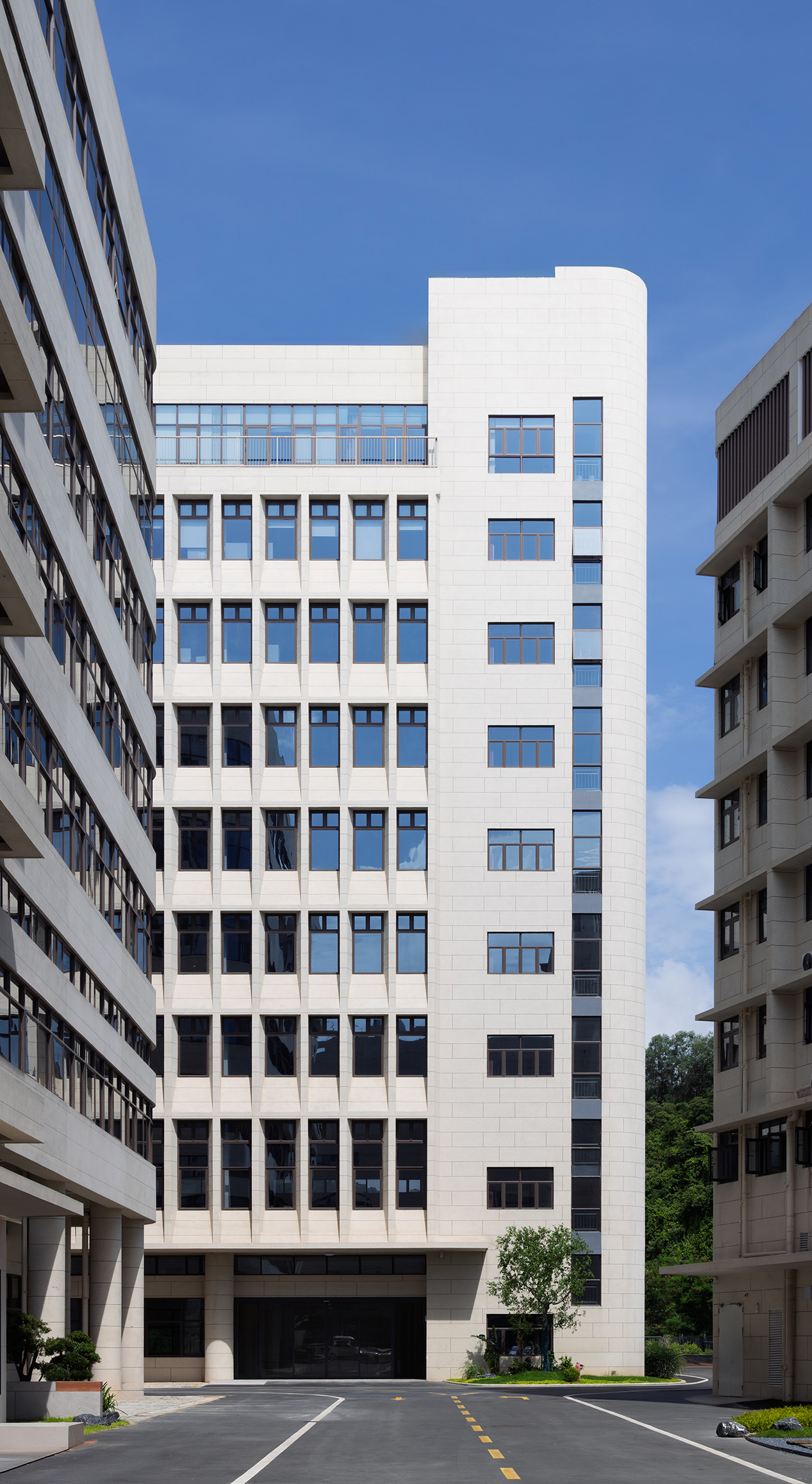 2025亚太空间设计大奖赛十大杰出青年设计师获得者范怡弈,在设计珠海兴丰晟科技大健康基地的过程中,以大健康为主题,以“功能优先、生态融合、现代美学、人文关怀”为核心设计理念,进行了一体化通盘考虑的建筑规划与室内设计的全过程设计。建筑上采用差异化的体量与形态(矩形 + 圆角矩形),创造圆润温暖的建筑外观,可满足不同功能需求(如研发、办公、配套等)。建筑内部的空间划分能通过外立面的 “模块感” 设计实现灵活布局,既保证大空间的开放性,也能通过竖向线条的分割营造私密办公区,提升空间利用率。建筑的模块化解构(外立面的矩形单元、竖向线条)符合现代产业建筑的标准化需求,便于施工与后期功能调整;而差异化的形态设计(如右侧建筑的圆角)又赋予每栋建筑独特的标识性,避免 “千篇一律” 的工业化刻板印象,助力园区形成独特的品牌形象。